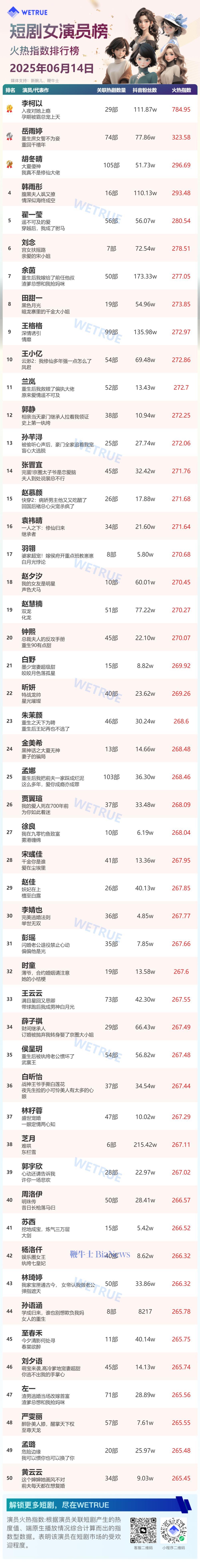 6月15日,为帮助短剧从业者提供更多信息,专注于短剧报道的新腕儿和科技媒体鞭牛士联合WETRUE短剧热度榜共同推出多种短剧热度榜。