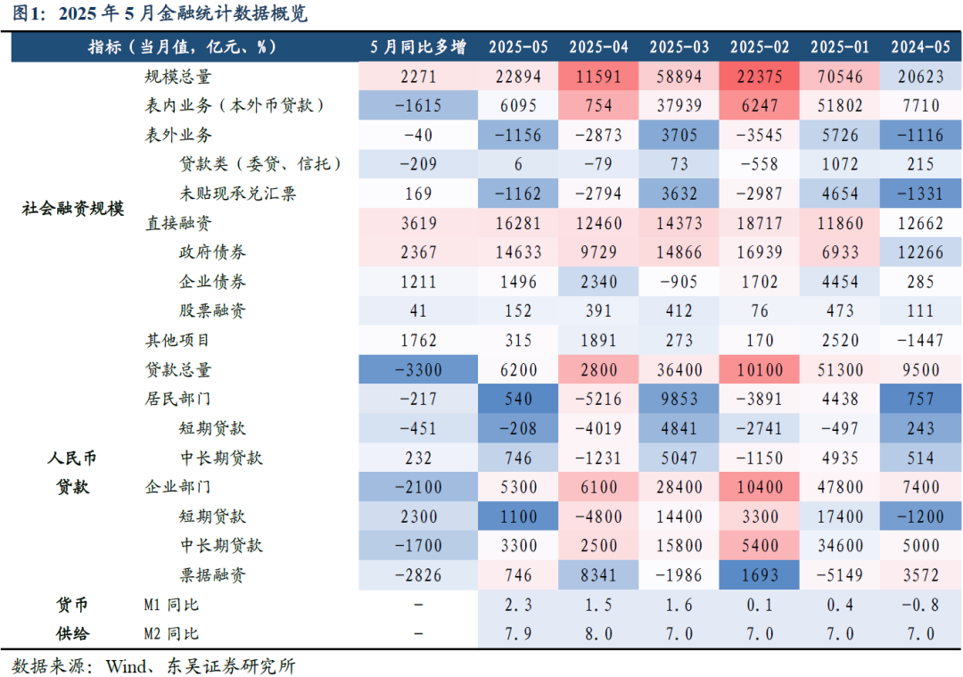 (1)社会融资规模:2025年1-5月新增社融18.63万亿元,同比多增3.83万亿元,截至5月末,社融存量同比增速持平于8.7%。5月份新增社融22,894亿元,从社融分项来看,政府债券融资继续支撑社融,5月政府债券融资增长14,633亿元,同比多增2,367亿元,5月社融口径新增人民币贷款5960亿元,同比少增2,237亿元;5月“委托贷款+信托贷款+未贴现银行承兑汇票”三项表外融资合计减少1,156亿元,其中未贴现银行承兑汇票减少1,162亿元,同比少减169亿元。