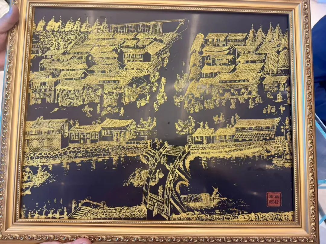 双方联手推出了首款跨界融合作品《幸福顾村》,以92岁老人刘振禄先生创作的《顾村老街荻泾河风情图》为蓝本,运用最新的激光雕刻技术复刻顾村老街风貌线稿,再结合百宝镶嵌工艺,让百年老街的烟火气,以“可佩戴”的方式重现。