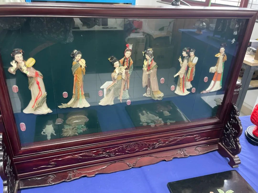 “选用的材料比较多也比较丰富,有猛犸牙、寿山石、青田石、莱阳石,还有玉石、石决明、螺钿……作品比较大型,目前它的难度系数在中国百宝镶嵌的技艺领域也算是顶级的。”