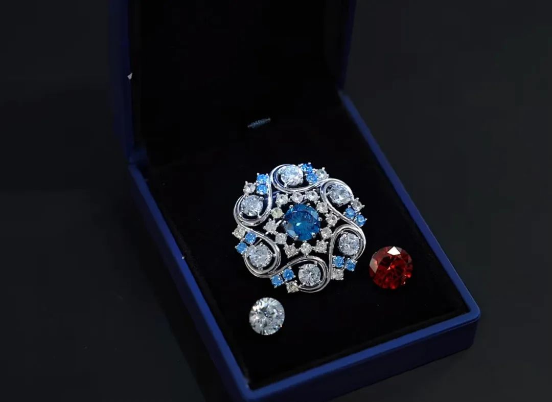 去年初,团队与区内科技企业芯飞睿合作的“晶彩”系列诞生了:晶体碎块镶嵌成星空图案的胸针,价格只有传统工艺的三分之一,却多了一份现代美学的冷峻质感。“当时的产品一下子爆火了。”