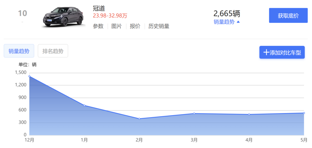 零售数据显示,2023年至2024年,冠道销量分别为32542辆和16272辆,今年前5月累计销量为2665辆,在本田汽车产品中排名第十名,其中5月销量为533辆。