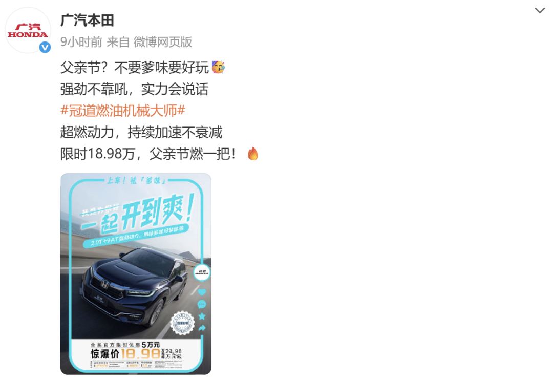 6月15日,广汽本田官方宣布,冠道全系限时优惠5万元,优惠后售价为18.98万元起。作为参考,此前冠道售价区间为23.98-32.98万元。