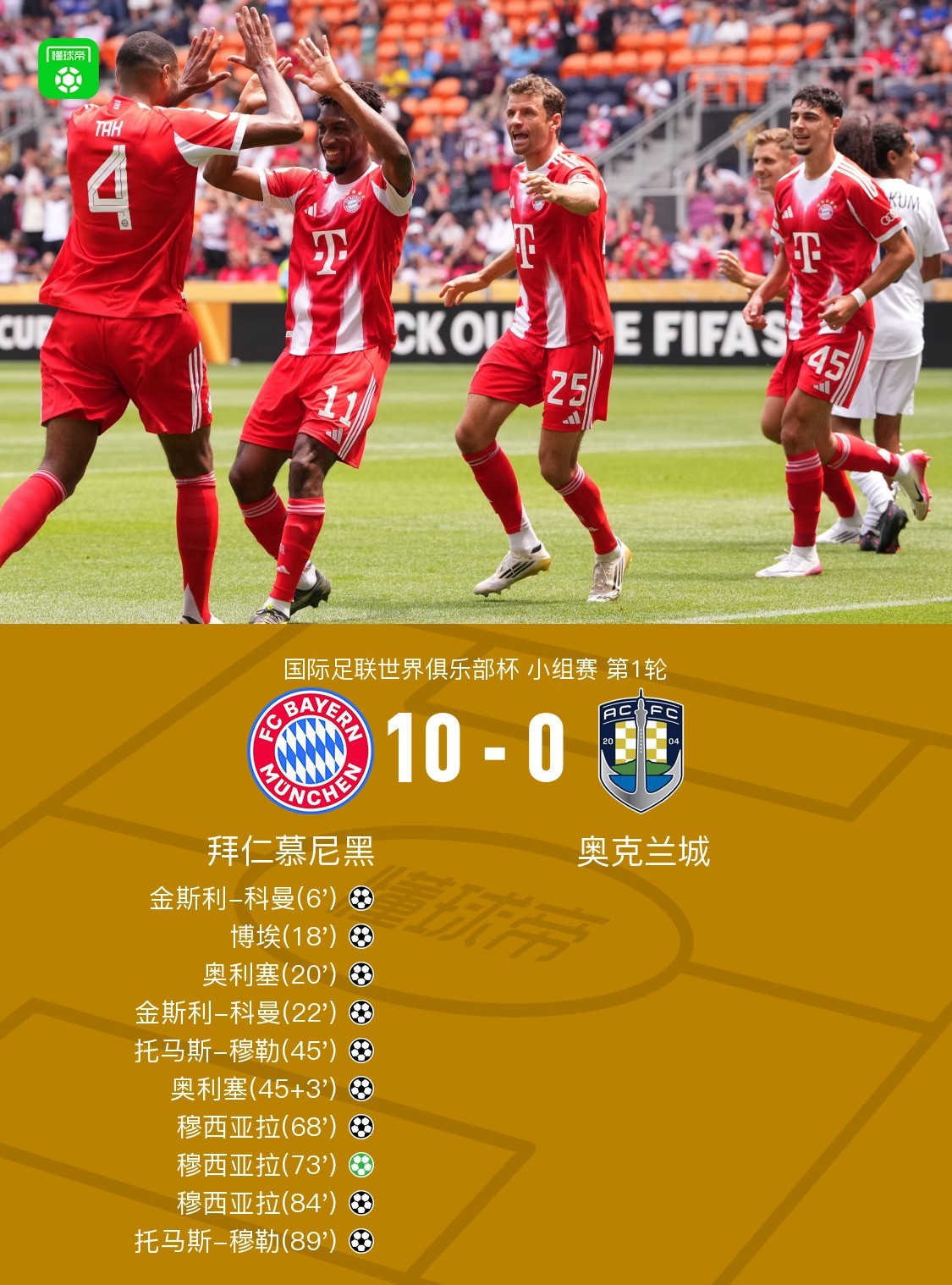 北京时间6月16日国际足联世界俱乐部杯 小组赛 第1轮,拜仁慕尼黑对阵奥克兰城。拜仁慕尼黑金斯利-科曼梅开二度,博埃破门,奥利塞梅开二度,托马斯-穆勒梅开二度,穆西亚拉帽子戏法。最终比分拜仁 10-0 奥克兰城。