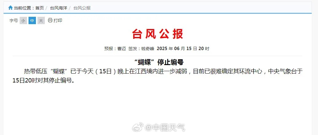 6月16日,据中国天气网消息:昨天白天,台风“蝴蝶”的低压环流结合冷空气,给广东北部、江西、浙江、福建西北部、上海等地带去了强降雨,暴雨成片,局地出现了大暴雨夜间,“蝴蝶”进一步减弱,中央气象台对其停止编号。