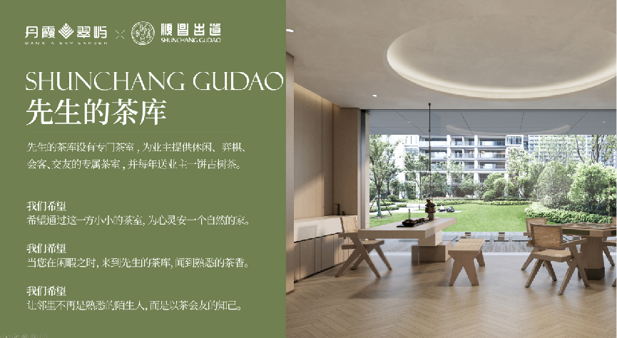 联动云南普洱茶协会副会长单位——顺昌古道,定制打造先生茶库。先生的茶库设有专门茶室,为业主提供休闲、弈棋、会客、交友的专属茶室,并每年送业主一饼古树茶及举办茶山研学以及茶学文化沙龙,以茶香为媒,串联家族记忆与社交雅韵。