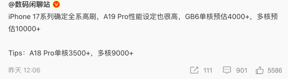 根据@数码闲聊站 的爆料,预计今年年底推出的 A19 Pro 芯片性能有进一步提升,单核成绩预计在 4000 分、多核 10000+;但 A17 Pro 升级到 A18 Pro 尚且有平均 19% 的性能提升,现在从 18 升 19 的提升幅度,真不敢恭维。