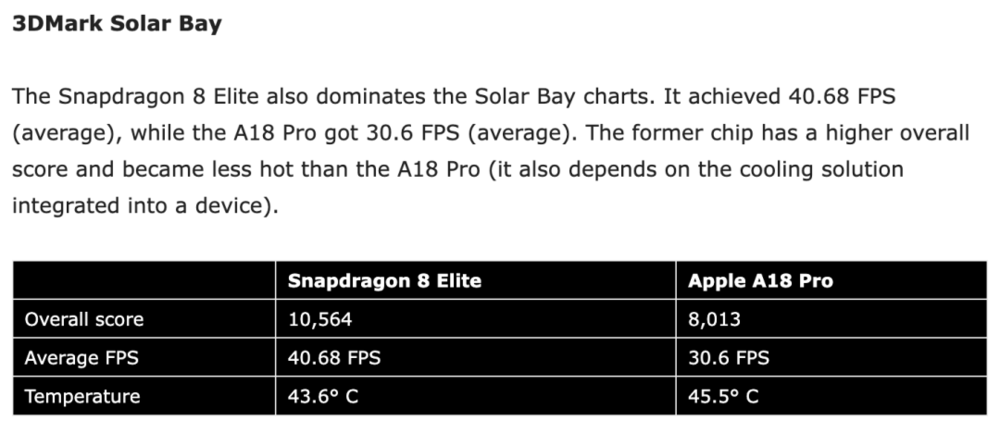 至于图形性能,在 3DMark WildLife Extreme Stress 测试中,骁龙 8 至尊版的稳定性为 82.4%,而A18 Pro 为 68.1%;在 Solar Bay 测试中,骁龙 8 至尊版的平均帧率为 40.68 FPS,A18 Pro 为 30.6 FPS。