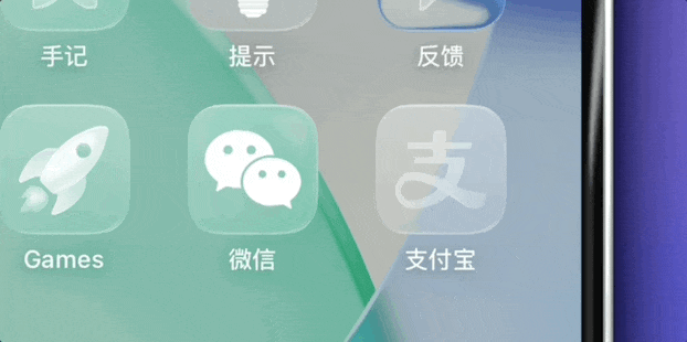 这样的细节还出现在“透明色”的桌面图标上,滑动“玻璃块”的图标,穿过图标的线条也会和你的壁纸一一对应。
