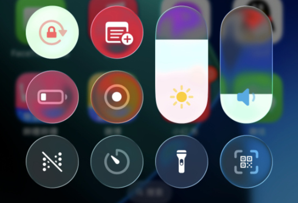 比如控制中心整个页面变成了一块玻璃,下侧边缘滑动掠过的地方也会出现光线折射、线条变形甚至是彩边特效,观感就像大弧边钢化膜贴在了屏幕中间。