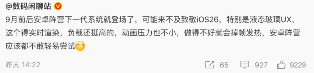 数码博主@数码闲聊站 就专门提到,苹果的这套液态玻璃 UX(交互界面)因为需要实时渲染,“负载还挺高的,动画压力也不小”,可能会间接导致安卓阵营不会跟进。