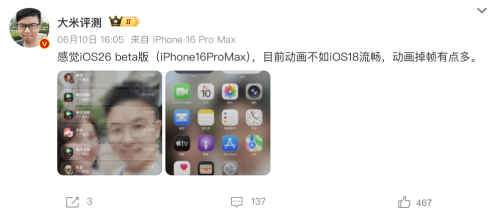 新特性对手机性能压力不言而喻。除了我自己的体验,网上也有不少更新到测试版的网友都说新版本的卡顿、发热明显严重了很多,续航也有明显降低。甚至相比过去 iOS17、iOS18 的首个开发者预览版,这个版本的卡顿和 bug 也更多。
