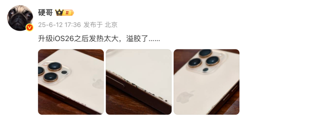 更搞笑的是数码大V @硬哥 说自己的iPhone 升级了 iOS26 之后发热太大,直接把手机热溢胶了。