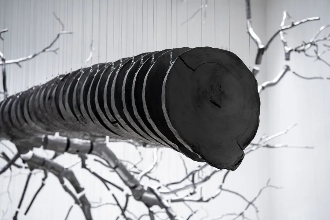 这在艺术家处理树木时尤为显著:他将拆迁现场获得的桐树以反透视切割法(从9公分递增至2米)重组,通过尺寸的逆向延展模拟“逆生长”的视觉逻辑,既消解了树木作为生物遗骸的悲剧性,又以涂抹赋予其符号重生。这种对材料的敬畏源于东北民俗中的生命观,促使他将创作行为本身视为对城市化进程中消逝自然的伦理救赎。
