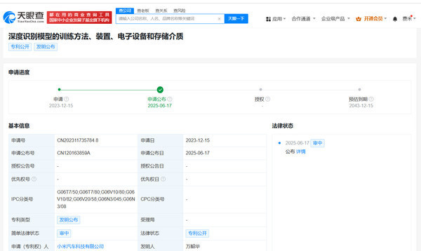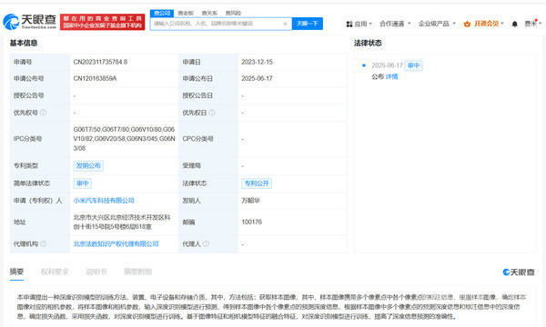 天眼查知识产权信息显示,近日,小米汽车科技有限公司申请的“深度识别模型的训练方法、装置、电子设备和存储介质"专利公布。该专利发明人是万韶华,法律状态为审中,代理机构为北京法胜知识产权代理有限公司。
