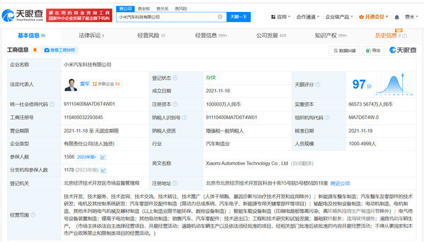 公开资料显示,小米汽车科技有限公司是小米集团旗下专注于智能电动汽车研发与制造的全资子公司,成立于2021年11月18日,注册资本100000万元,法定代表人为雷军。