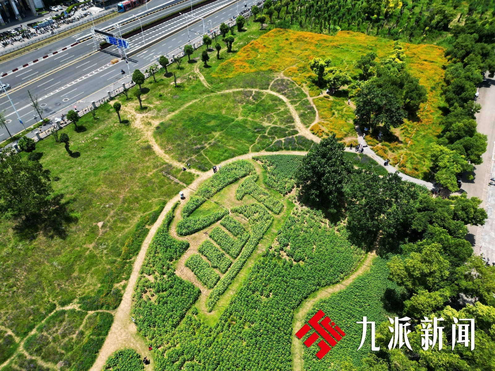 华中科技大学总务后勤处物业服务中心主任助理刘锋告诉九派新闻记者,为让向日葵在毕业季如期盛放,后勤部门精准把控种植时间。4月初,包括园林团队、学校学生在内的上百人,共同参与了向日葵花苗的种植工作。从设计、创意到种植,这片花海汇聚了师生们的集体智慧。