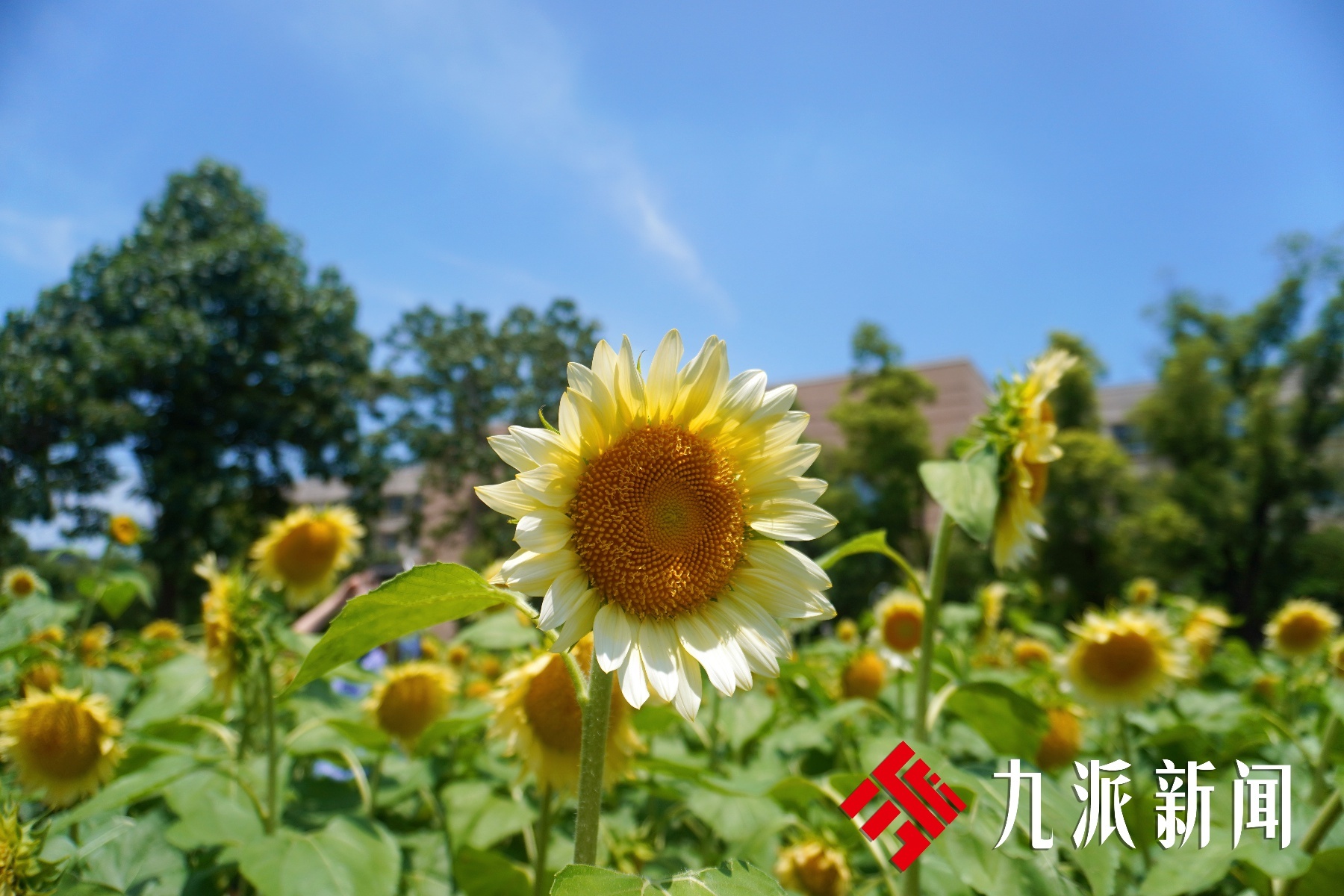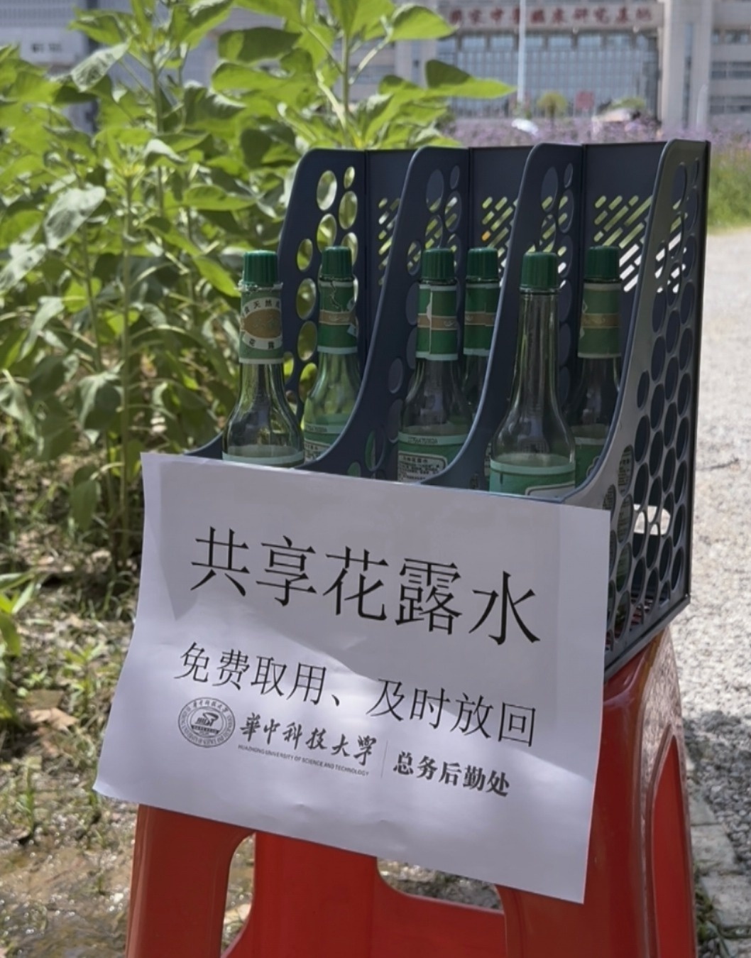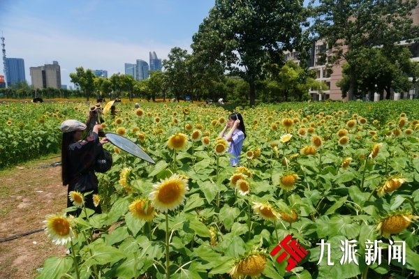 6月17日,九派新闻记者在校园内看到,西十二楼南侧的向日葵已经盛开了大半,它们昂首向阳,尽显傲然之姿。即使烈日当空,仍有众多师生穿梭在花海中拍照。入口处,一张凳子上摆放着一筐花露水,写着“共享花露水,免费取用,及时放回”。