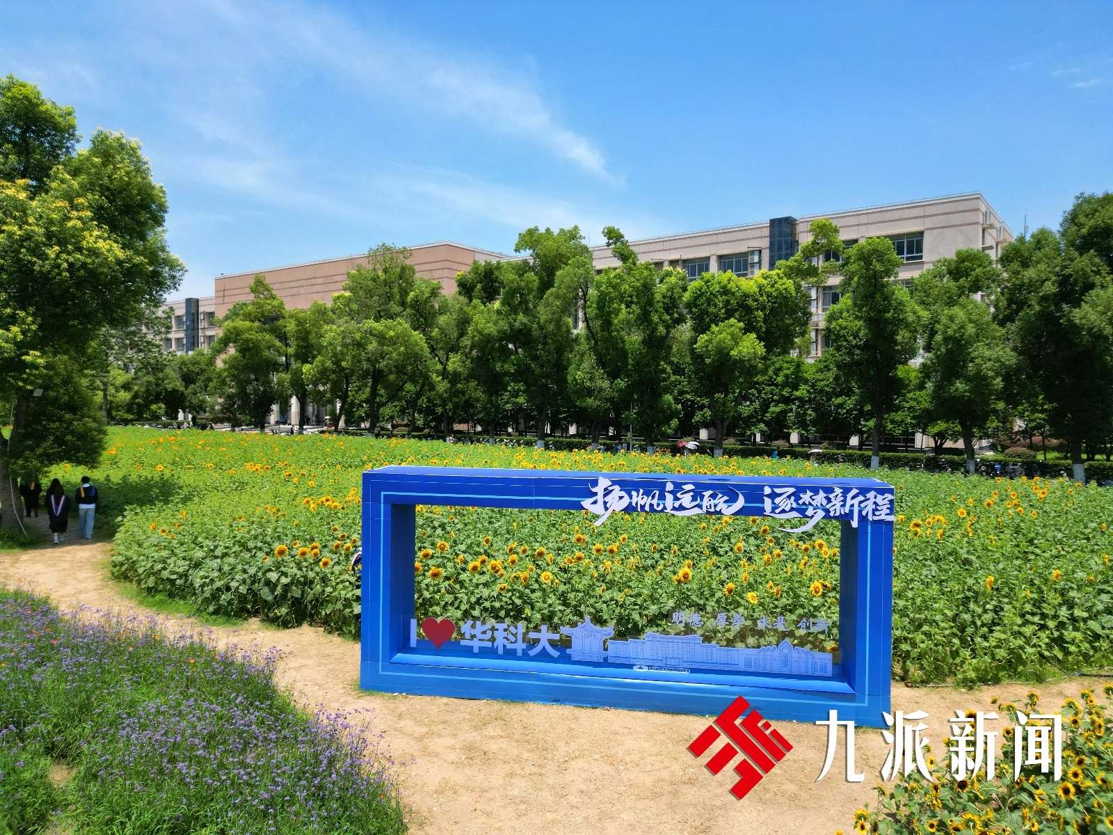6月以来,华中科技大学南三门附近的向日葵竞相绽放,宛如一片金色的海洋,这使其迅速成为毕业生们钟爱的拍照场地。据介绍,花海总种植面积达12900平方米,并巧妙地融入学校logo,传递母校对学子前程似锦、一路繁花的美好祝福。
