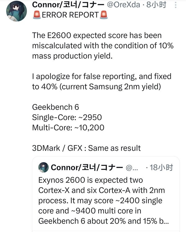 最初,@OreXda 称该芯片单核得分为2400,多核为9400。但随后他更正数据,表示真实成绩为单核2950,多核高达10200。这意味着相较于前代Exynos 2400,单核性能提升约15%,多核提升约20%,足以与安卓阵营最强芯片一较高下。