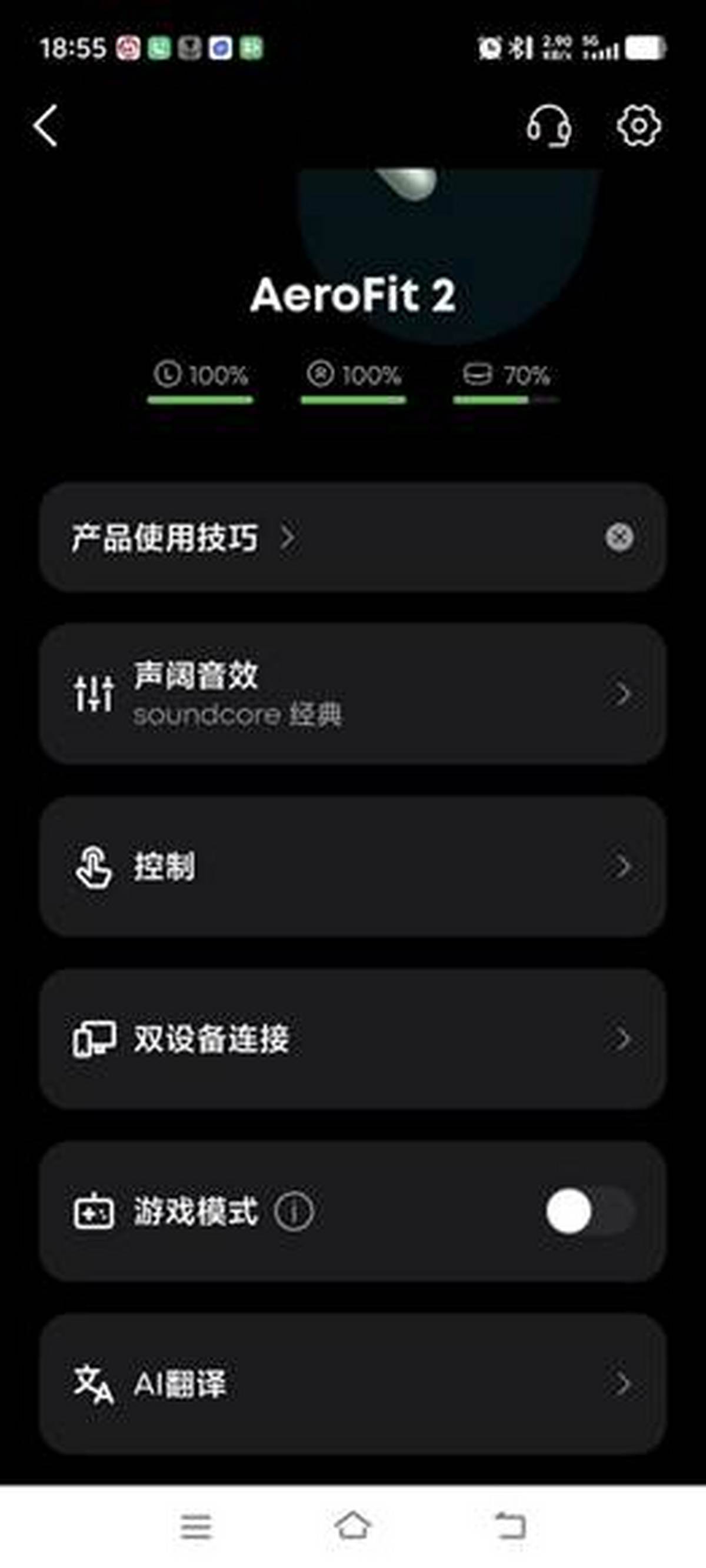 点击进入后有丰富的选项,包括使用和维护技巧、EQ音效、控制设置、双设备连接、游戏模式、翻译等。而底部中间的小LOGO则可以实现一些冥想、放松等场景音乐,还有更多有意思的探索空间,开启全新生活方式。