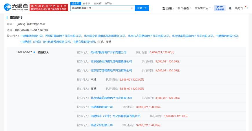 天眼查司法案件显示,近日,中赫集团有限公司、北京国安足球俱乐部有限责任公司、周金辉等新增一则恢复执行信息,执行标的36.8亿余元,涉及借款合同纠纷案件,执行法院为山东省济南市中级人民法院。