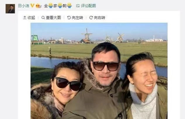有一年,江珊在微博给田小洁庆生,田小洁回复时带了一张三人全家福,还特地配文:“全家齁。”