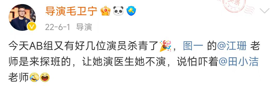 导演和江珊也是老相识,打趣问道邀请她出演戏里的医生角色为什么没同意,江珊回答说:“怕吓着田小洁。”