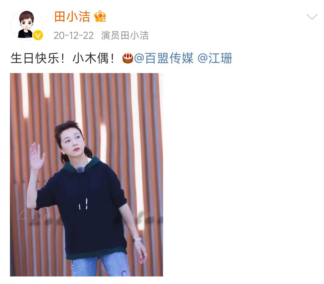 2020年,田小洁在微博公开为江珊庆生,还亲昵地喊她“小木偶”。