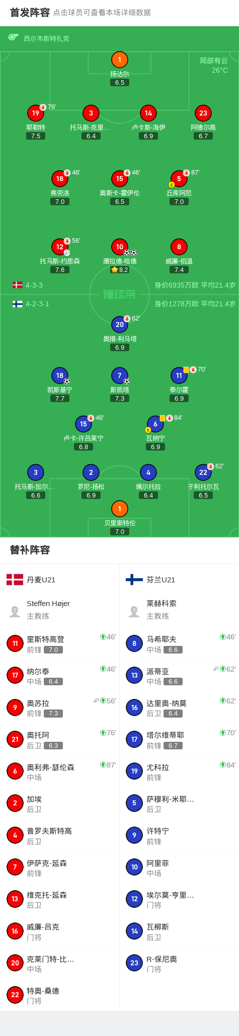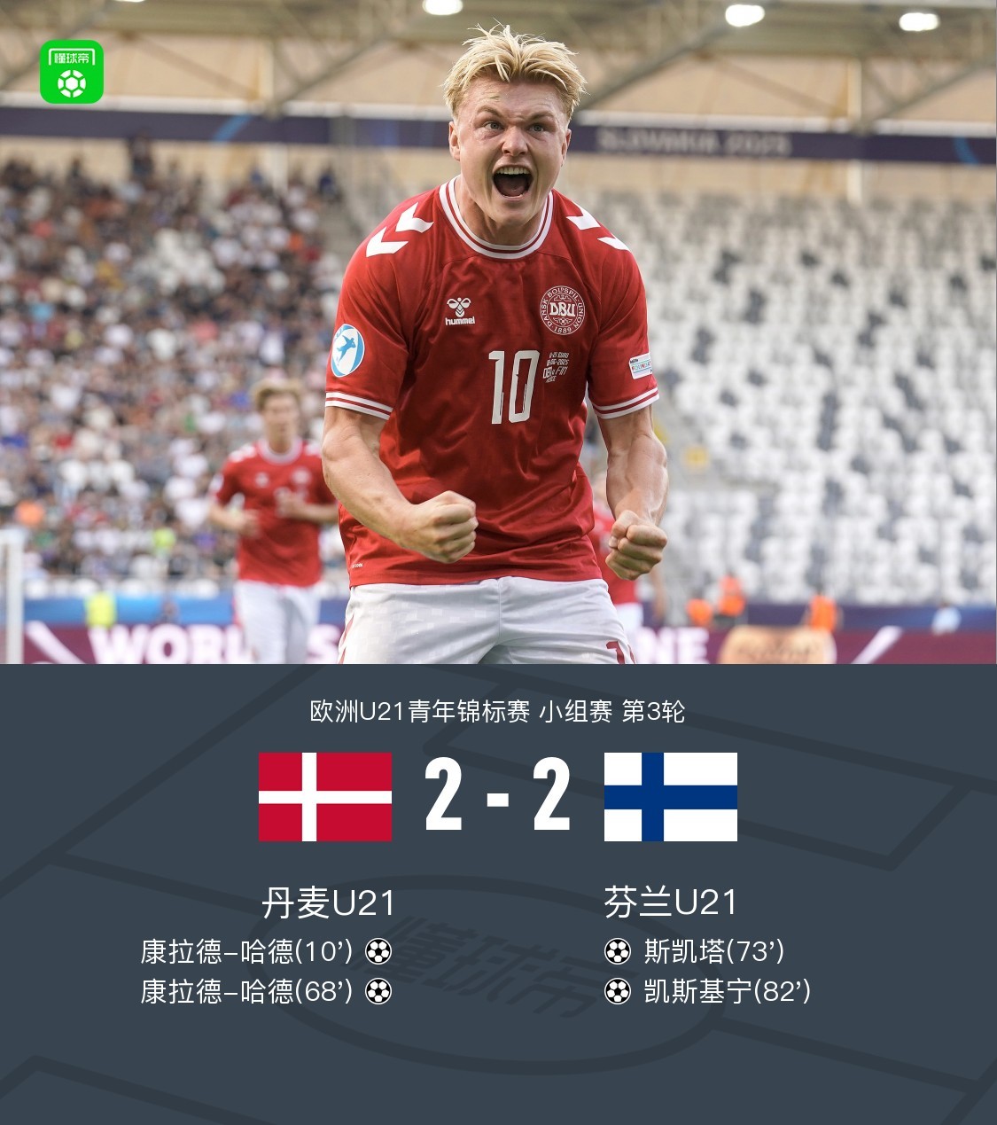 北京时间6月19日,欧洲U21青年锦标赛小组赛第三轮,丹麦U21与芬兰U21展开较量。比赛中,康拉德-哈德表现出色,完成两粒进球,为丹麦U21确立领先优势。芬兰U21则由斯凯塔扳回一城,随后凯斯基宁再入一球,将比分扳平。最终,双方以2-2战平。