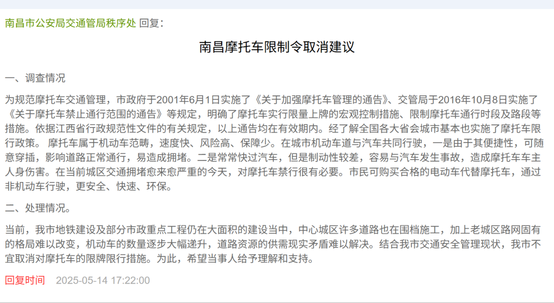 都市现场记者注意到,今年5月,针对网友取消南昌摩托车限制令的建议,南昌市公安局交通管局秩序处在“问政江西”曾做出以下回复: