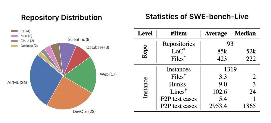 SWE-bench-Live的首批任务涵盖了1319个真实Issue,涉及93个开源项目,领域包括AI/ML、DevOps、Web开发、数据库、科学计算等多个方向。这种多样性与高频实时更新使SWE-bench-Live的评估更加准确,更能反应模型能力的高低。