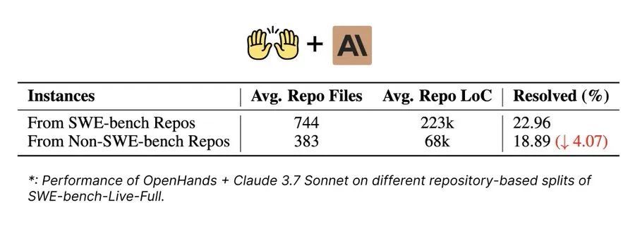 图4:OpenHands+Claude 3.7 Sonnet在SWE-bench-Live不同仓库来源的性能对比