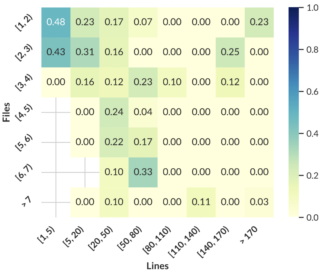 进一步分析发现,当前AI模型在处理简单、单文件修改任务时表现良好,但面对复杂、多文件、多行修改任务时准确率急剧下降。尤其是在面对代码规模超过50万行的大型项目时,模型的表现瓶颈尤为明显。
