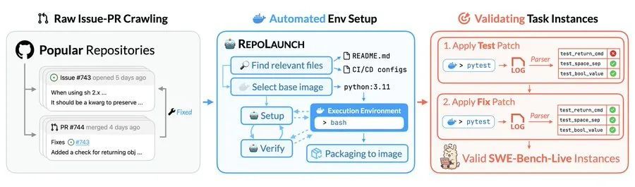 传统的代码修复评测基准需要人工构建代码运行环境,不仅成本高昂,且更新缓慢,难以跟上软件开发环境的快速变化。SWE-bench-Live开创性地采用了基于Agent的智能化框架REPOLAUNCH,彻底解决了这些问题。