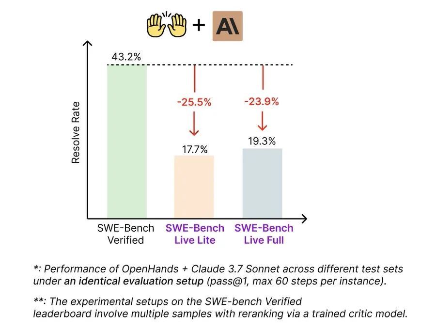 首次基于SWE-bench-Live的全面评测结果显示,当前顶尖大模型和代码Agent的表现大幅下滑。