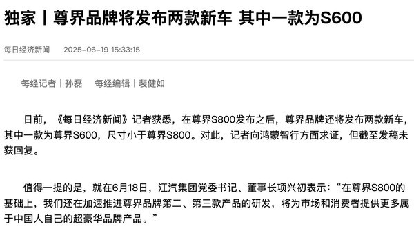 【CNMO科技消息】近日,有消息称,在尊界S800正式发布并启动批量投产之后,尊界品牌还将推出两款新车型,其中一款为尊界S600,定位低于S800,或将面向更广泛的豪华车消费群体。对此,鸿蒙智行方面暂未回应。