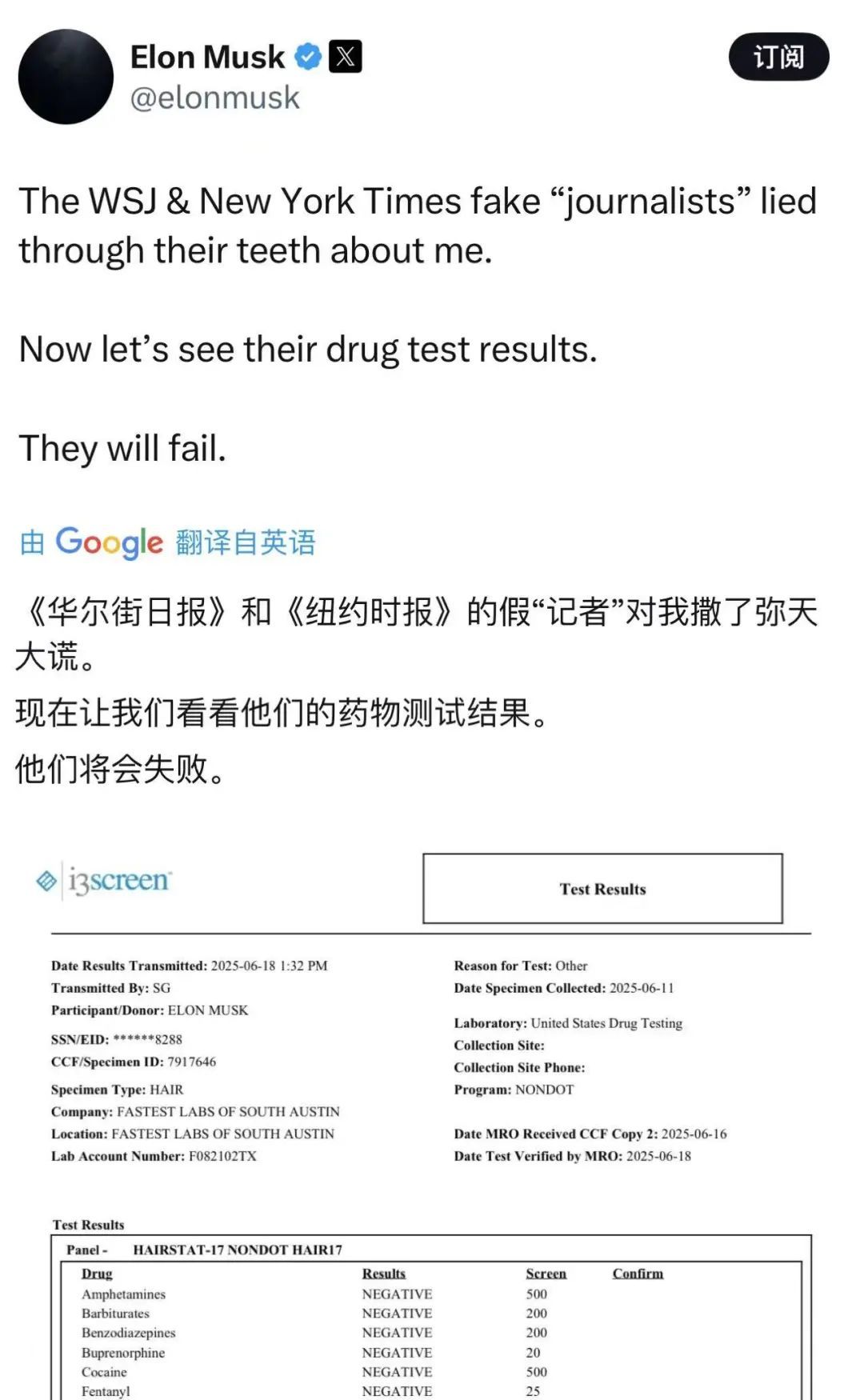 6月19日,马斯克在X平台上晒出了自己毛发的毒品检测报告,并表示华尔街日报和纽约时报的假记者撒谎,现在让我们看看他们的吸毒检测结果,他们将会失败。