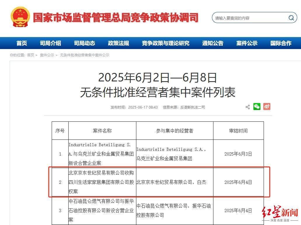 微成都报道 日前,根据国家市场监督管理总局公示,京东旗下北京京东世纪贸易有限公司(简称“京东世贸”)收购四川生活家家居集团有限公司(简称“生活家”)股权案获无条件批准,正式审结日期为2025年6月4日。