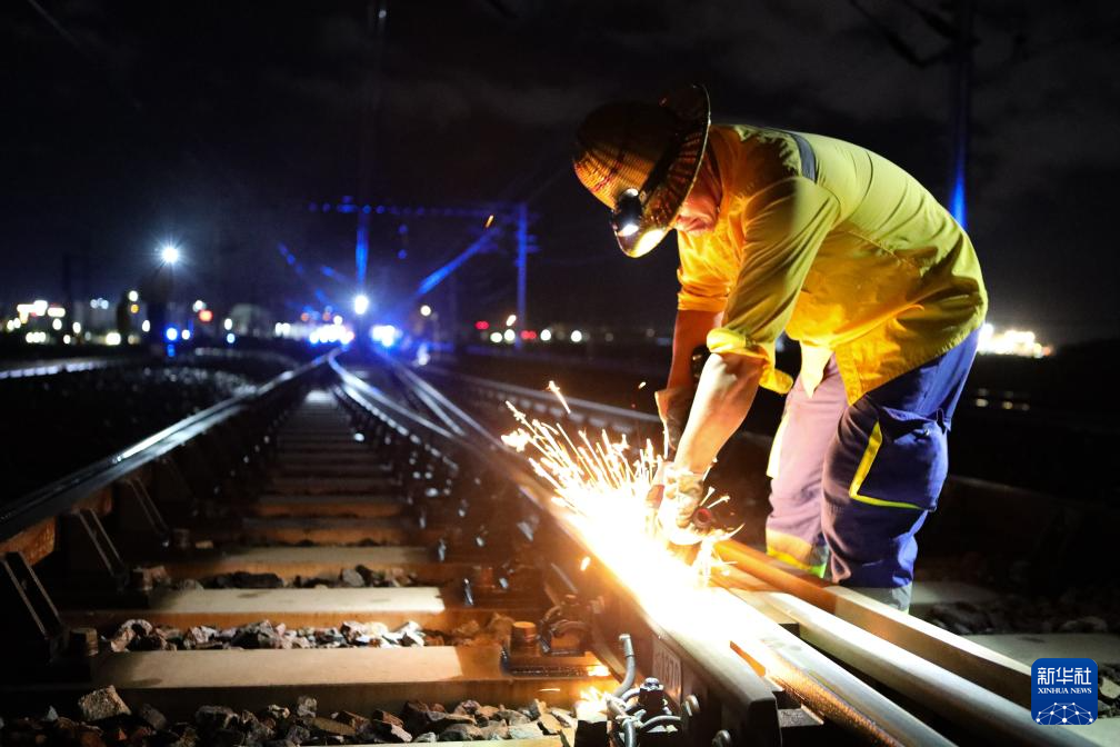 6月19日,中国铁路昆明局集团有限公司普洱基础设施段作业人员在中老铁路西双版纳站进行钢轨肥边打磨作业。