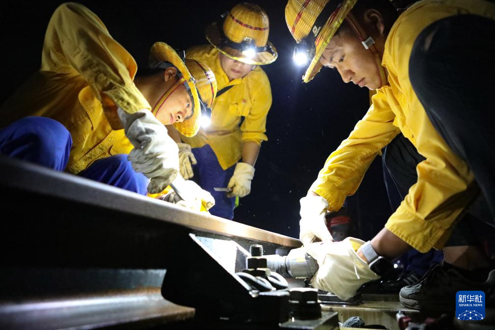 6月19日,中国铁路昆明局集团有限公司普洱基础设施段作业人员在中老铁路西双版纳站进行紧固螺栓作业。