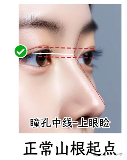 把山根高度降低到两瞳孔到内眼角水平线之间,会有更减龄幼化五官的效果。