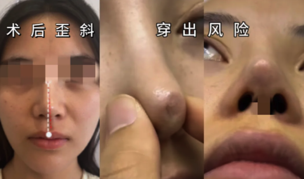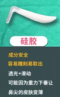外观上L型假体下方没有支撑物,很难长久的对抗地心引力,就会对皮肤产生挤压作用,后期会导鼻尖皮肤变薄、变红甚至穿出皮肤。
