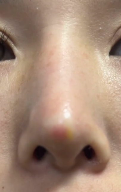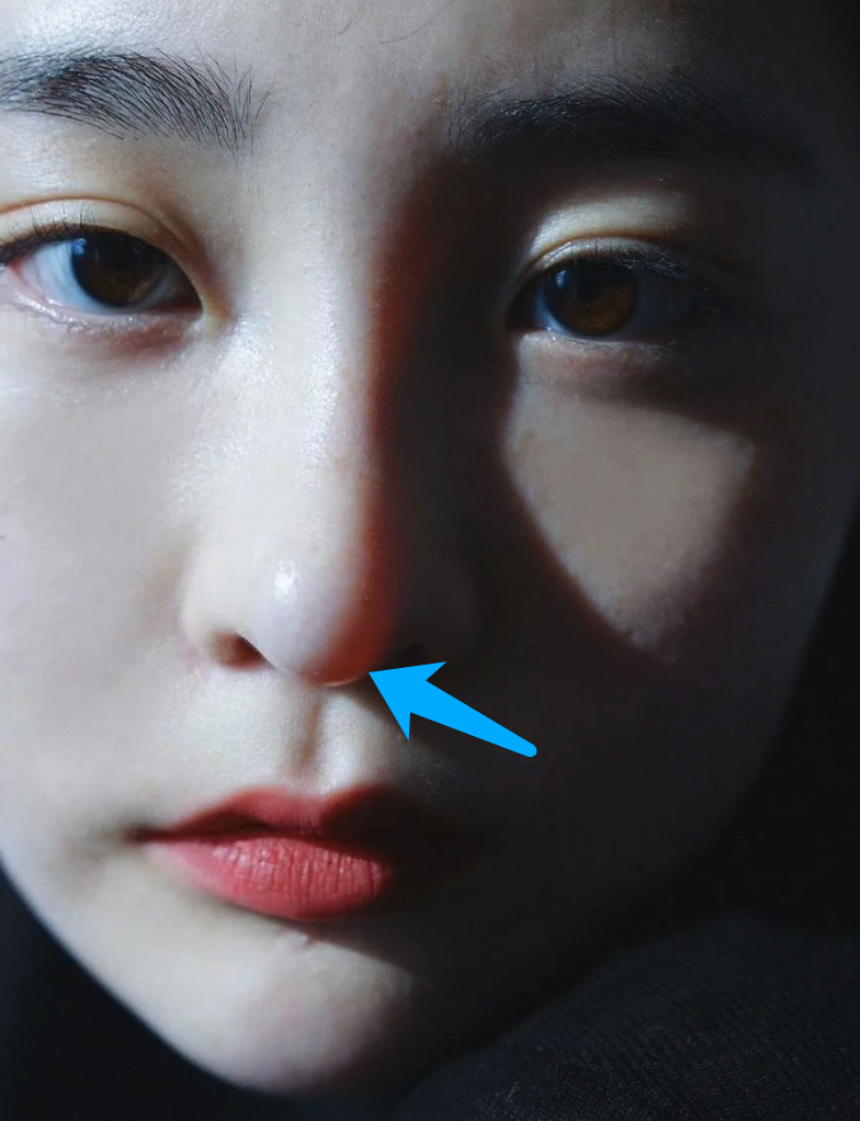 今天不探讨导致金敏荷鼻头透光的因素究竟是什么,