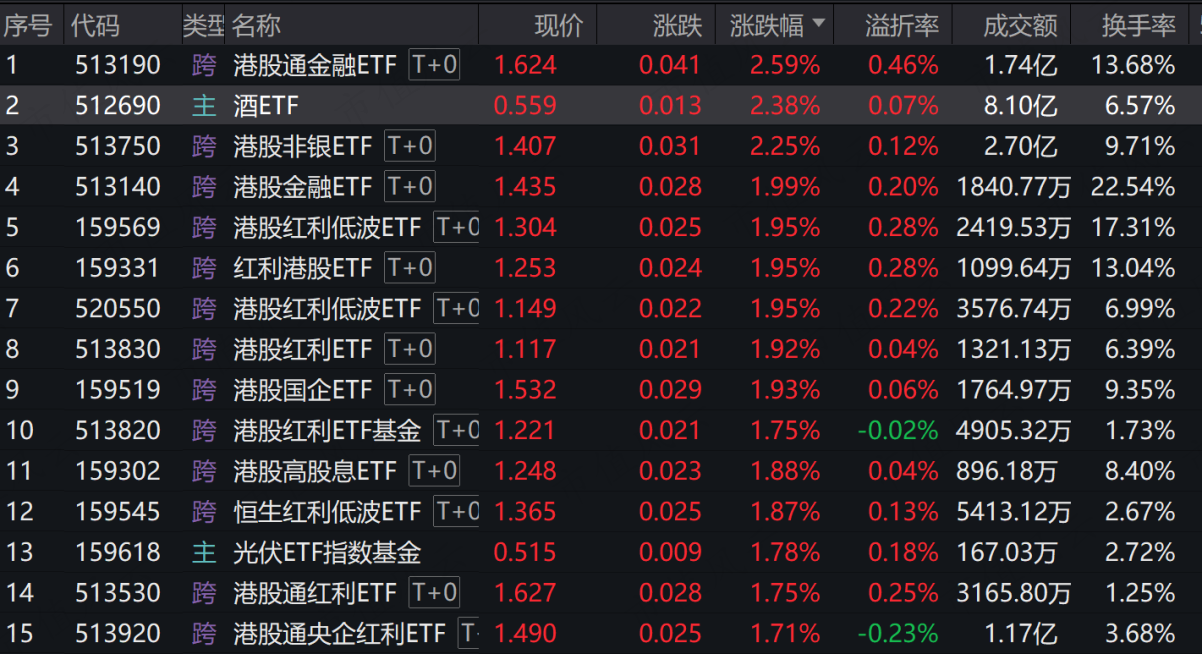 ETF方面,多只红利、高股息跨境类ETF登上涨幅榜单,港股通金融ETF(513190)以2.59%的涨幅排名第一,紧随其后的港股非银ETF(513750)涨2.25%,港股金融ETF(513140)等6只ETF涨超1.9%。