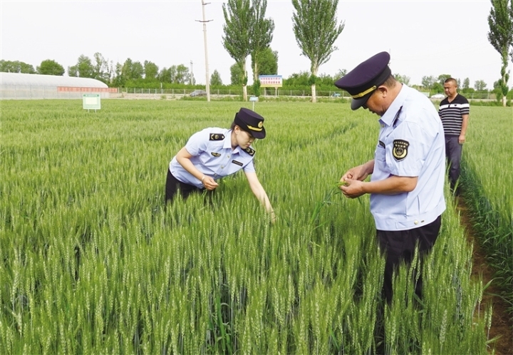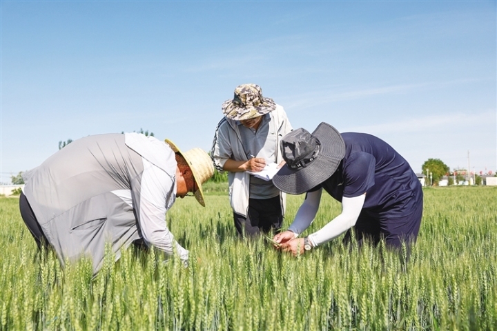 脚上沾满泥土的安娅芝和同事在试验田对农作物进行检疫。炎炎烈日没能挡住他们对生态健康农业发展的执着和热情。安娅芝说:“我们按照国家新一轮粮食作物大面积单产提升工作要求,通过引进筛选优质高产品种,充分发挥品种的增产特性,配套测土配方施肥、绿色植保、小麦‘一喷三防’等技术措施,全力保障国家粮食安全。”