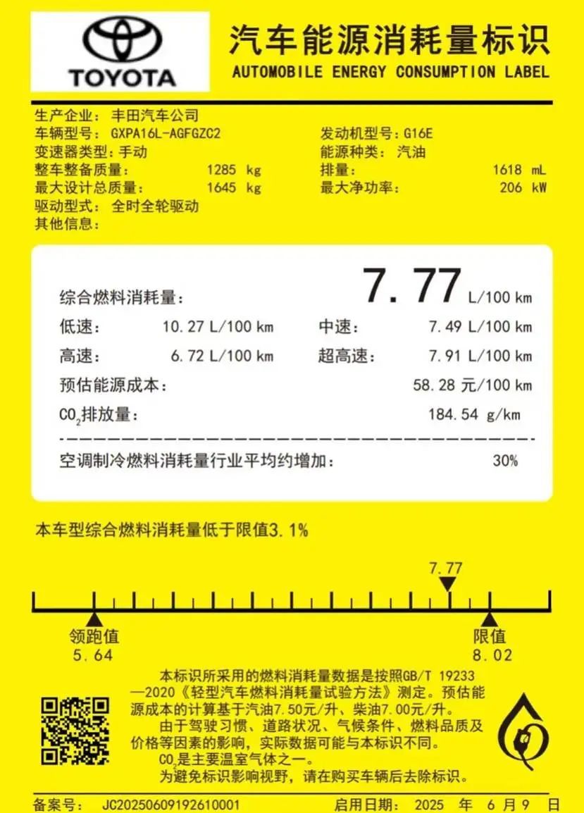 国内延期上市许久丰田GR雅力士,这回可能真的要来了。近日有消息称,该车的汽车能源消耗量已在工信部查询系统中有了更新。从能源消耗量黄纸上可以看到,中规版GR雅力士的综合燃料消耗量为7.77L/100km,启用日期为2025年6月9日,以及该车的一系列动力参数。