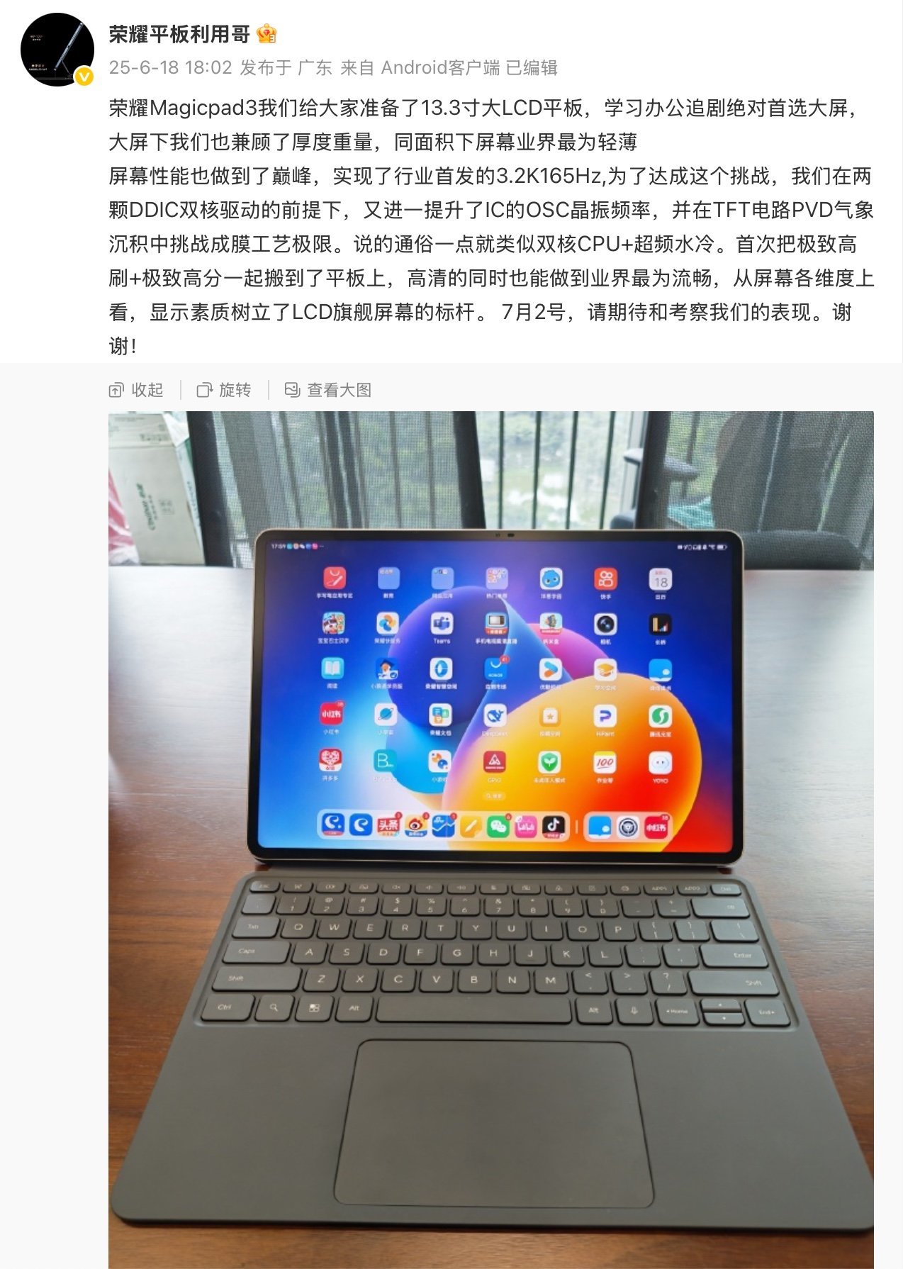荣耀Magic Pad 3 将在 7 月 2 日正式发布,并且这位总经理也表示,产品将在发布当天开售。如果你也对平板的屏幕有比较高的要求,不妨期待一下荣耀Magic Pad 3。