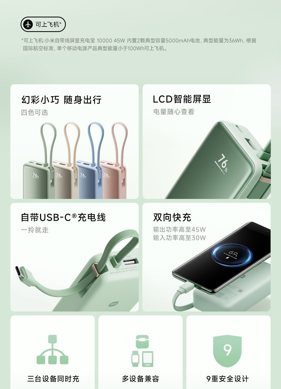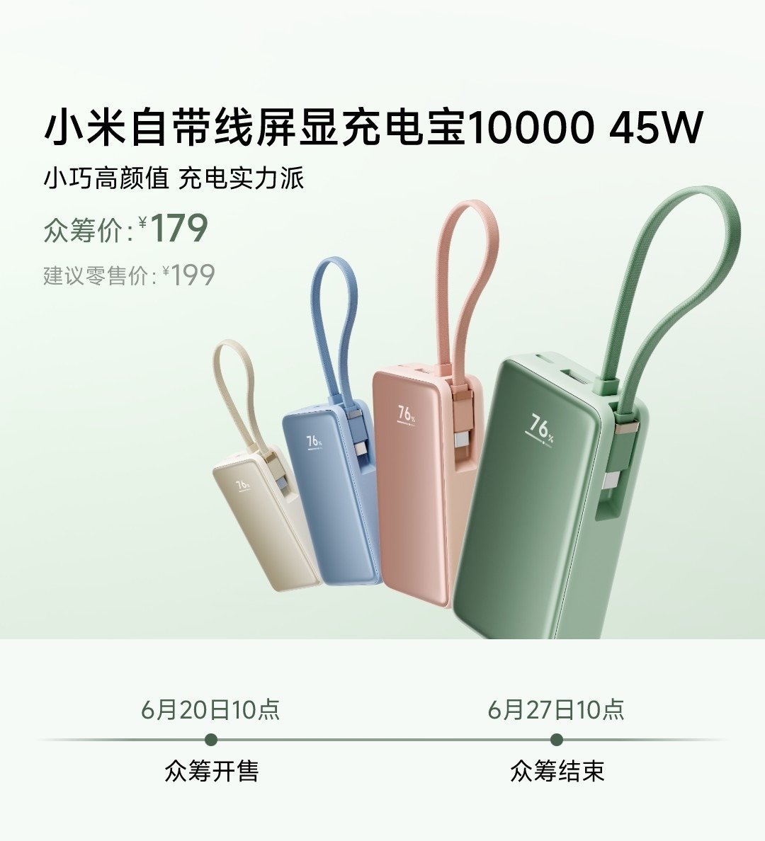 6 月 20 日,小米推出自带线屏显充电宝 10000 45W,目前已经在小米众筹页面上架,建议零售价为 199 元,众筹价则是 179 元。