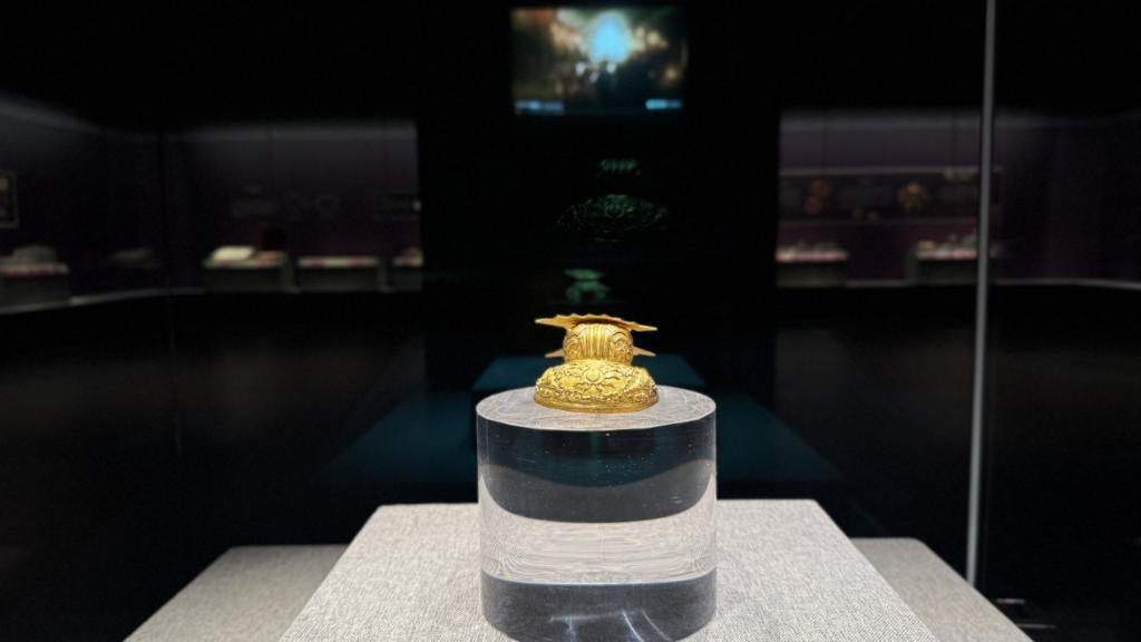 展览中,一件双龙戏珠纹金冠吸引了众多观众驻足。姜晔说:“金冠的前高后低设计,使得正面冠沿上的双龙戏珠纹格外引人注目。球形冠体上的海水纹和花叶纹,更是为金冠增添了别样韵味。整款金冠设计精巧,堪称明代金工艺术杰作。”